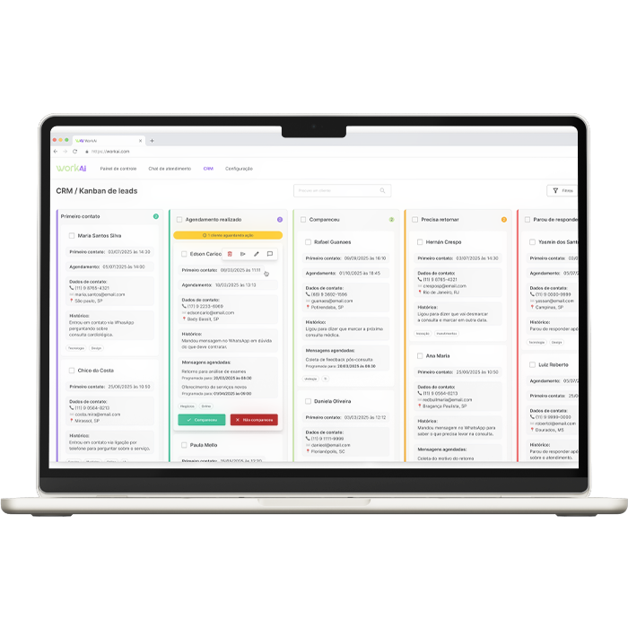 • Monitoramento de agendamentos, retornos e interações no WhatsApp;